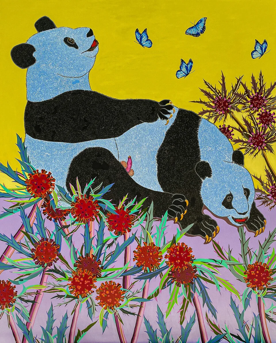In early 2020, two Giant Pandas (Ying Ying and Le Le) in a Hong Kong zoo, mated naturally for the first time in a decade. It was theorized that the lack of crowds due to the Pandemic was conducive to their mating. In my rendering, they are mating in a field of thistle with Coronavirus “flower buds”.